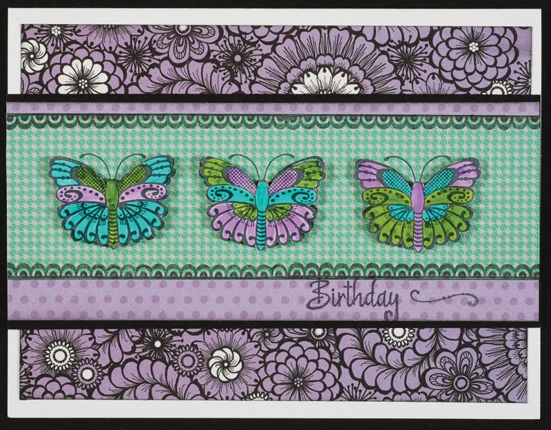 Stamp Simply Susan Stamp Set border on top and bottom long edges of 6 1/2”x2” Simply Susan aqua houndstooth. Evenly space 2 Simply Susan Stamp Set butterflies across the center. Stamp 3 more butterflies on Glossy White Cardstock and color with Spectrum Noir Pens: LV1 purple, DG3 green and BT4 turquoise. Cut out and foam tape over images stamped on Simply Susan hounds tooth paper.