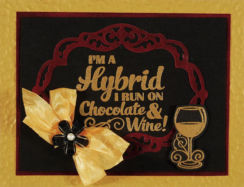 Place the card fold at the top. Cover with Hammered Gold paper. Cut 5 1/2”x4 1/4” black cardstock and stamp/gold emboss center with Smart & Sassy Sayings “I’m A Hybrid…”