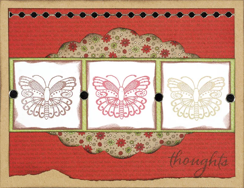 Trace Design Tool Kit #3 Scalloped Oval onto Red Velvet brown/red/green floral paper. Ink edges black and glue to the card center. Ink edges of three 1 3/4” white cardstock squares brown. Stamp a large Simply Susan butterfly in each square using brown, red and guacamole ink.