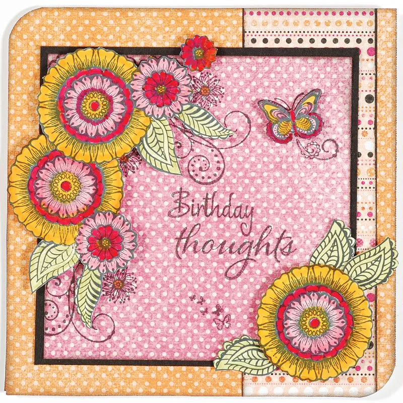 Ink edges of 4” square of Grapefruit pink dot paper. Stamp Simply Susan double flower with leaves stamp at the top left and also down the top right edge of the pink dot paper. Stamp Simply Susan “Birthday Thoughts” below and to the right of flowers on pink dot paper. Stamp medium butterfly at top corner and group of tiny butterflies below greeting. Mat the Simply Susan pink dot square with black cardstock, leaving 1/8” border. Glue to the card center.