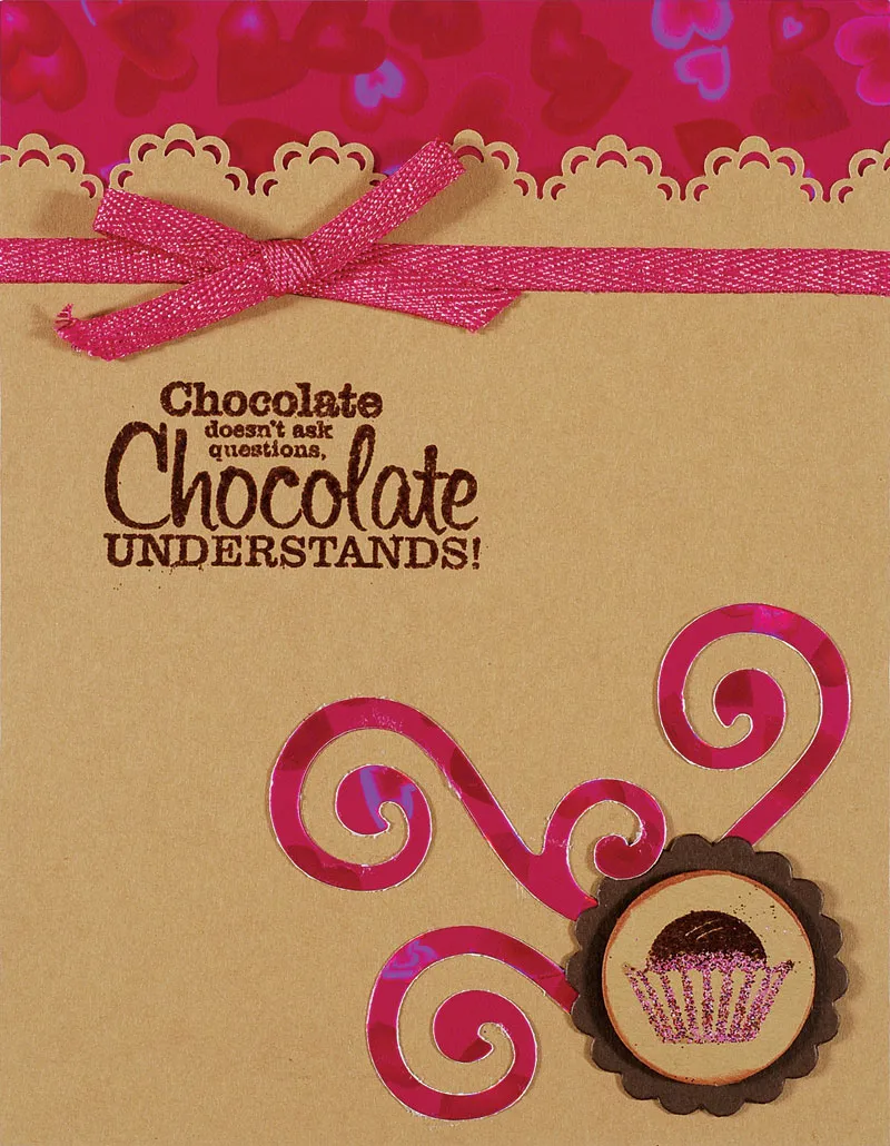 Stamp/brown emboss Smart & Sassy Sayings “Chocolate doesn’t ask…&rdquo,; 2” from the top and 1/2” from the fold. Glue a length of pink Metallic Ribbon across the card, 1 3/8” from the card top. Use the ribbon to make a bow and Zot to the ribbon border, directly above the stamped greeting.