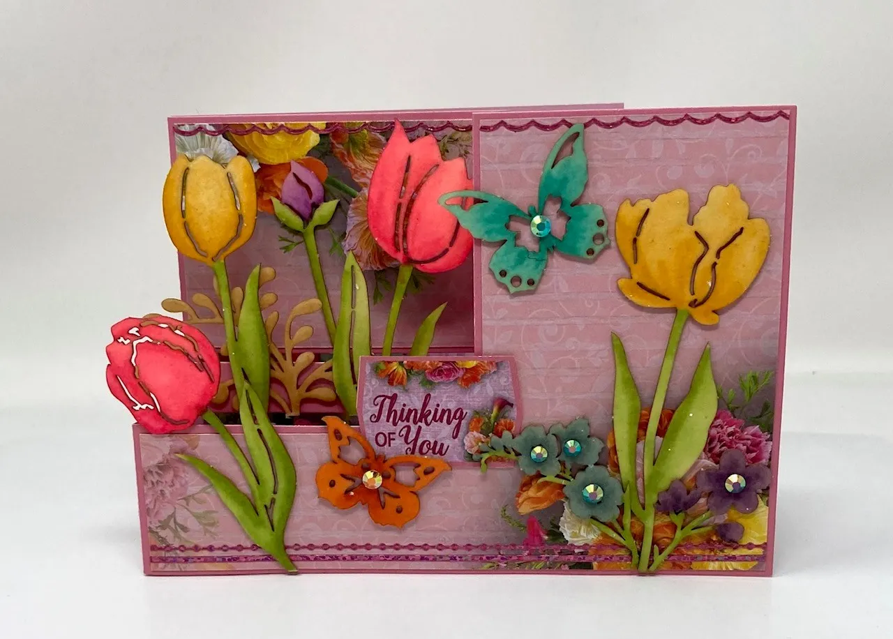 1. For the card: Die cut the card front and back from solid dark pink cardstock. Use the bone folder and follow the package directions to crease the score lines in mountain and valley folds. Place extra sticky tape on the inside surface of the tab, then attach it to the back piece, wrapping the tab to the card back.