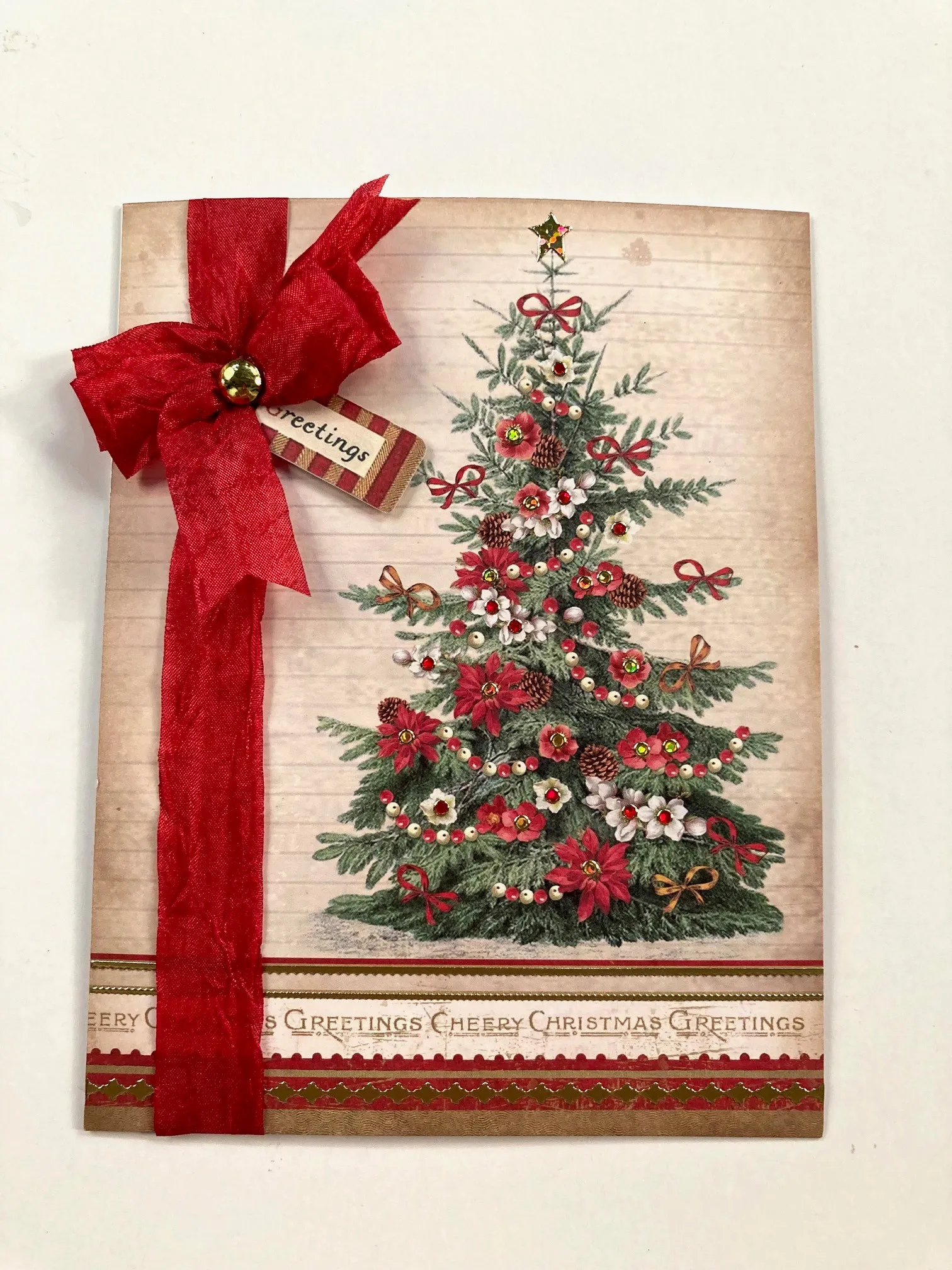 2. Wrap red crepe ribbon vertically, ½" from the left edge, and glue the ends to the back. Glue the cardstock to the blank card front. Make a 4-loop bow with crepe ribbon and tie the center with thread. Glue the bow to the first ribbon, 1¼" from the top.