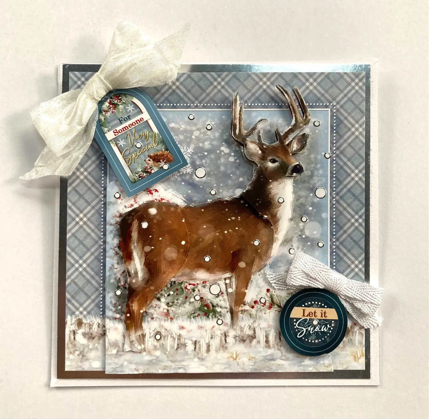 Mat the buck on Metallic Silver leaving a 1/8 " silver border. Cut out the buck and foreground, then the head and back leg/. Layer with foam tape onto the card. Foam tape "For Someone Very Special" and "Let it Snow" cutouts from the Square Little Book. Zot a 2" and 1 1/2" wide bow as shown. Place white Jewel Dazzles™️ stickers as shown. Glue this piece only to the bottom section of the card front.