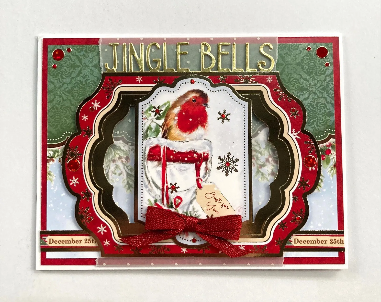 Die cut the "Jingle Bells" from gold metallic cardstock and leave 1/2" of the gold cardstock below it. Trim off the gold sides so it won't show through in the next step. Select the outer and middle frames of the robin die-cut. Glue the Jingle Bells behind the frames along the straight edge. Foam tape the frames sideways and flush to the blue edge tucking the die cut behind along top as shown. Double foam tape the Topper image to the center as shown. Zot™️ a 2" wide bow to the bottom of image. Glue two 1 1/2" long pieces of the Topper border on either side of the frame as shown. Place red Jewel Dazzles™️ stickers as shown.