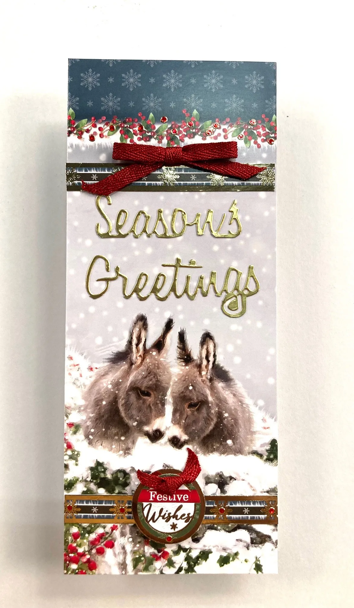 Middle Panel- Foam tape the donkey Topper along the half frame as shown. Zot™️ a knotted ribbon to the Topper.