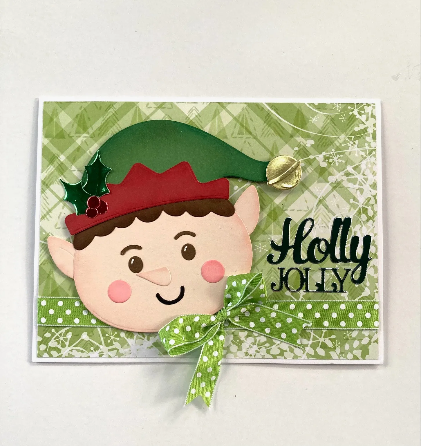 1. For the card front: Place the card with the fold at the top. Cut 6¼"x4¾" Joyful Christmas green snowflake plaid cardstock. Wrap lime dots ribbon across it, ½" from the bottom, and glue the ends to the back. Glue the cardstock centered on the card front.