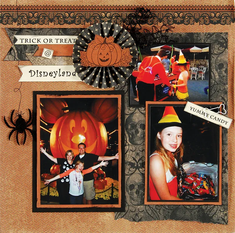 Right page: Mat three 3”x4” photos with black cardstock, leaving 1/8” borders and glue evenly spaced along the border at the bottom of the page. Mat 6”x4” photo with dark orange paper, leaving 1/4” borders. Ink edges and mat with black spider paper, leaving 1/2” borders at top and sides and a torn bottom edge. Glue 2 1/4” from left and 1 1/2” from the top.