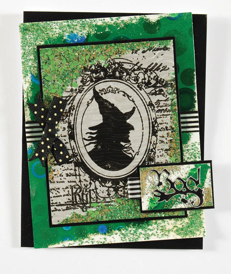 Cut the framed witch from the saved Silver Ripple stamped image. Apply VersaMark™ to the top and bottom, dust with Aged Hunter embossing powder and heat set. Sprinkle the embossed areas with Green Glass Glitter and Leaf Green Fragments and heat set from underneath. Foam tape in place. Place a bat Dazzles™ as shown.