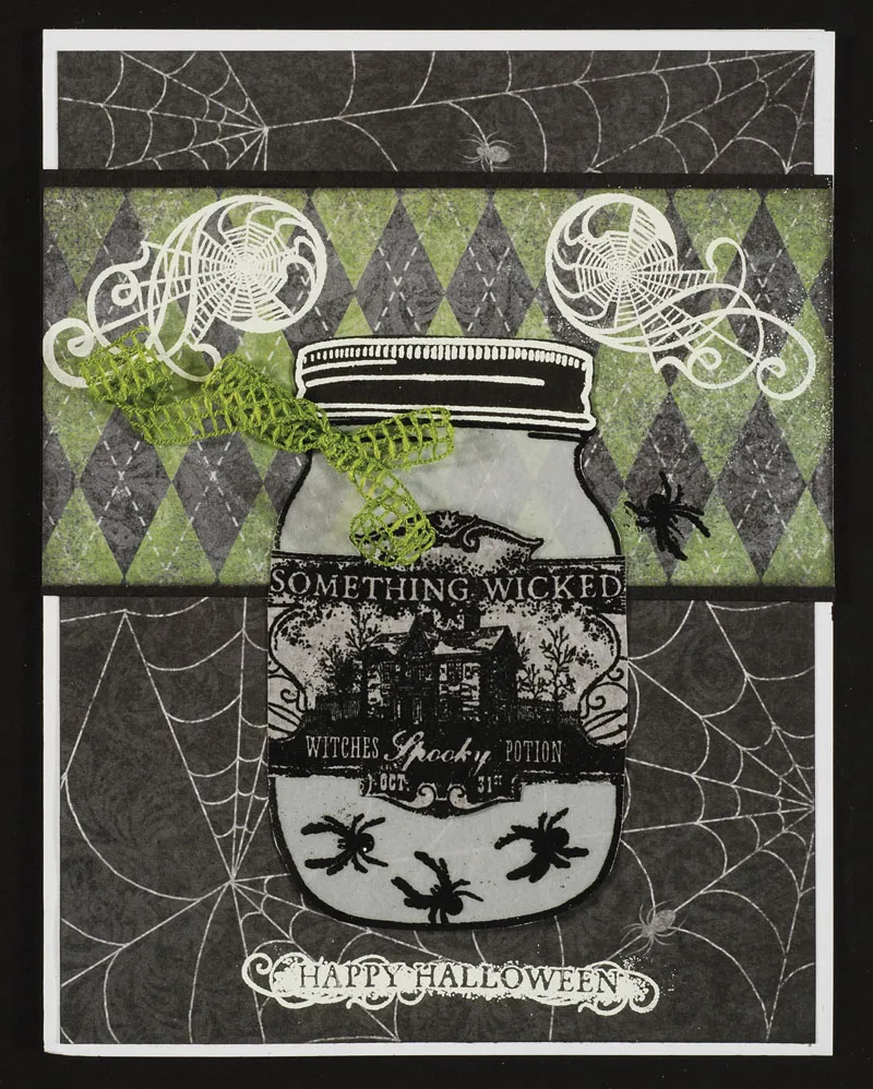 Black emboss the Well Preserved jar image on vellum with 3 Something Wicket spiders at the jar bottom, and cut out jar. White emboss the jar lid on black cardstock and cut out. Glue lid to the top of the jar. Black emboss the Something Wicked haunted house image onto Halloween gray paper. Cut out and glue across jar center and trim even with jar edges. Glue jar to the card as shown.