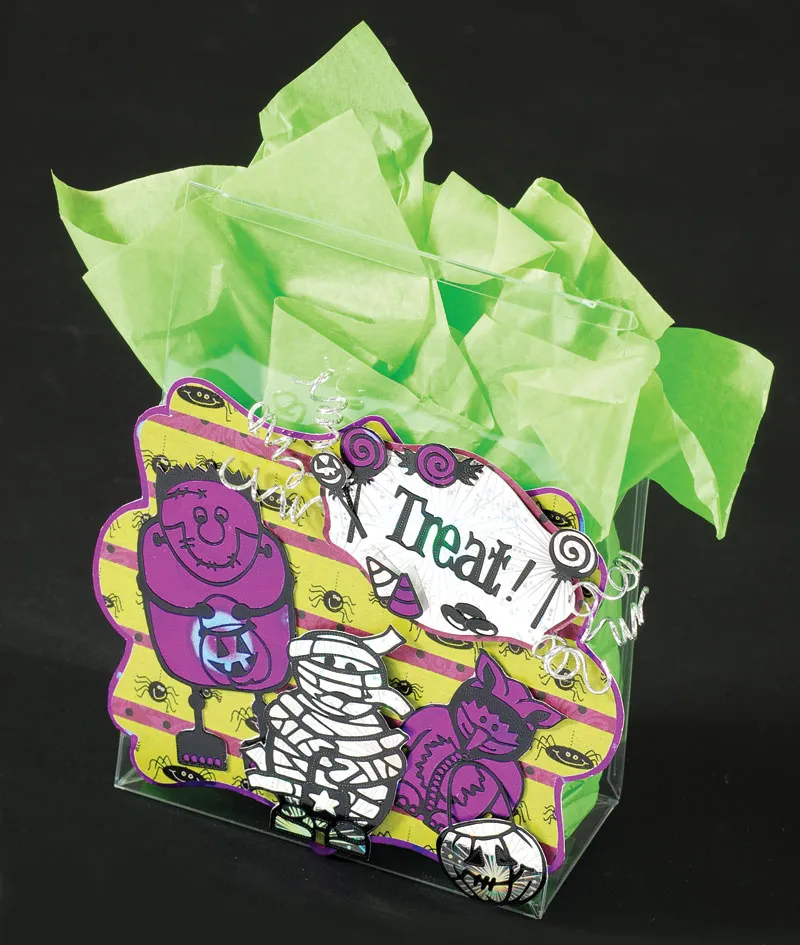 Back the Frankenstein and Little Monster Dazzles™ on Purple Circles paper and cut out along outer edges of the Dazzles™. Glue onto your label, as shown. Back the Mummy and Jack-O-Lantern Dazzles™ on Silver Fireworks paper and trim. Foam tape as shown.