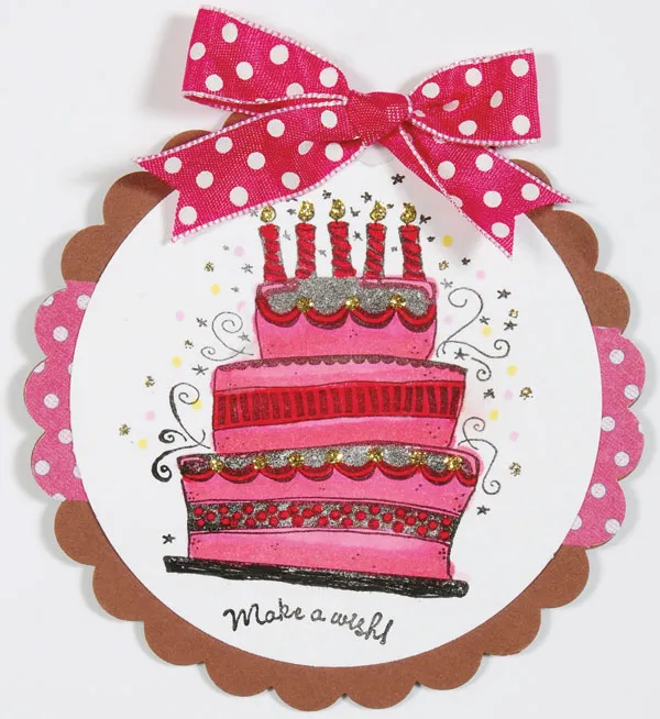 Stamp the cake in black ink onto the center of a 3” white cardstock circle. Stamp “make a wish” below. Color the candles and borders with 15 Geranium and the rest of the cake with 8 Rose Pink pen. Let the ink dry completely and color the bottom edge of the cake again to darken the area.