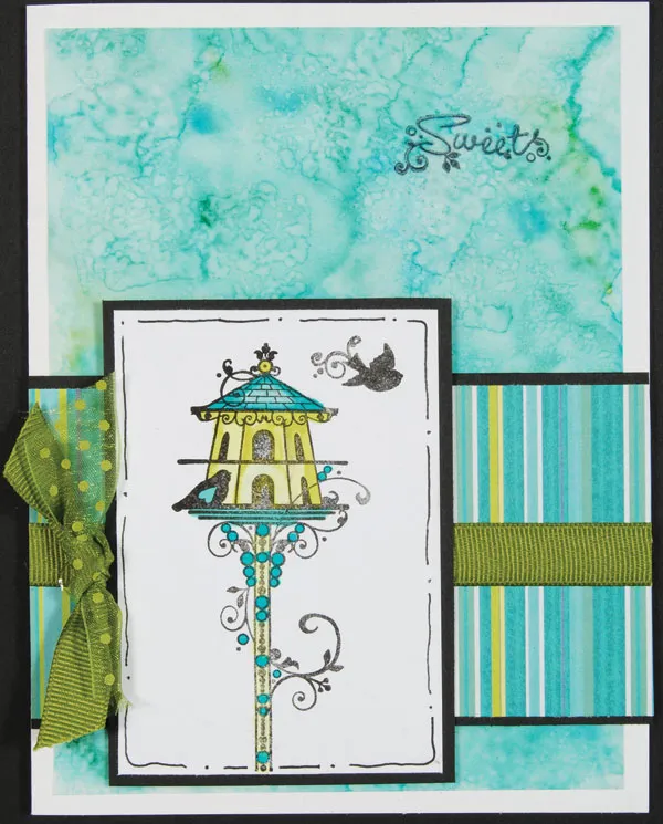 Mat the long edges of a 5”x 2 ¾” striped paper, with black glimmer paper, leaving a 1/16” wide border. Glue across the card, ¾” from the card bottom. Glue a length of grosgrain ribbon across the center. Stamp the birdhouse image onto 2½”x 3 3/4” white cardstock. Stamp a bird at the upper right corner. Outline the roof with color 68 turquoise and fill in with color 65 ice blue. Color in bird wing and dots with 68 turquoise. Outline house with 163 Green Bice. Color in with 48 yellow green.