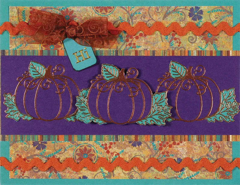 Stamp 3 pumpkins on teal cardstock and emboss copper. Cut out the leaves and glue over the leaves on the purple pumpkins. Mat the purple strip with striped paper, leaving a 1/8” border and glue across the card. Trace and cut a tiny tag from teal paper and ink the edges brown. Place a Dazzles greeting on the tag and glue under a bow at the top left side of the rick rack.