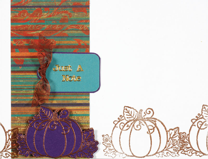 Inside: Glue a 2 1/2” piece of striped paper, 3/8” from the left side of the card. Stamp pumpkins across the bottom of the card and emboss copper. Trace a medium tag onto teal cardstock and mat with purple, leaving a 1/16” border. Glue to the right side of the border and place a Dazzles greeting. Add a knotted length of ribbon to the tag.