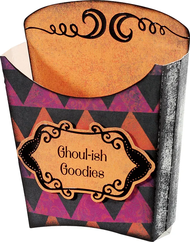 Peel off the two swirl Dazzles™ and the swirly frame Dazzle and place them on a spare plastic sheet protector or other non-stick surface. Tap with the StazOn® ink pad to color the Dazzles™ black. Let dry. Place the 2 swirls Dazzles™ on the orange panel as shown. Print “Ghoul-ish Goodies” in the center of 3”x1 1/2” of orange texture. Place the frame around the words. Trim around the frame, leaving a 1/16” border. Foam tape to the center of the fry box.