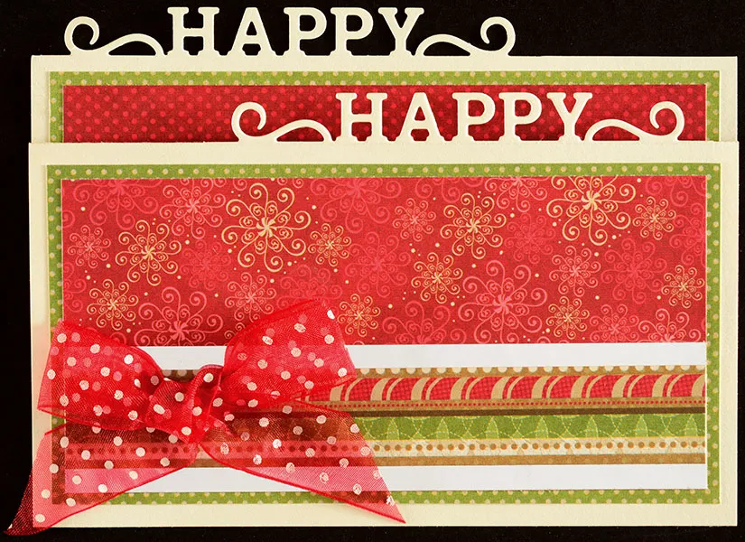 Card base: Score a horizontal line 4” from the top of 6 ½”x10” ivory cardstock, then score again, 2 ½” below the first score line. Use stencil tape to secure the “Happy” cutting die at the upper left corner of your card, even with the edges, and run through your machine. Tape the cutting die along the bottom score line, ¼” away from the right side (very important), keeping the tiny side notches in line with the score line. Run through your machine, then valley fold the upper score line and mountain fold the bottom score line to create an “S” fold card with “Happy, Happy” at the top.
