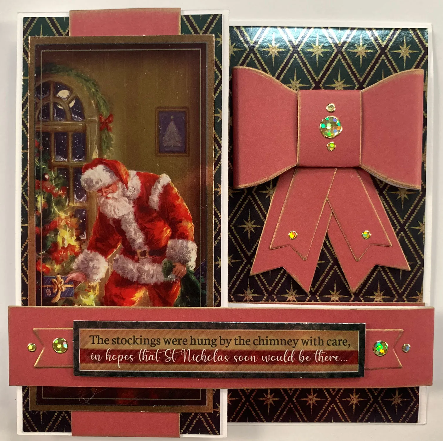 Cut a blank card to 5”x5”. Cut 7/8”x10” dark red paper from the Christmas Memories Cardstock and set aside. Fold the front card panel in half in a mountain fold. Choose the Topper sheet with diamonds. Cut two 2.25”x4.75” pieces and glue one to each of the front panels (note one goes inside the card). Cut 4.75”x4.75” piece and glue inside the card. Cut 1 1/4”x5” red Cardstock, ink the edges gold and glue to each section as shown. Glue a Topper die-cut to each panel on top of the red Cardstocks.