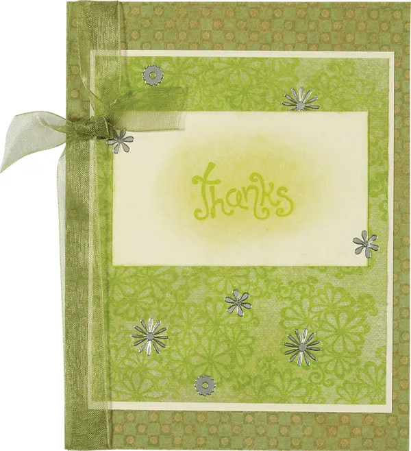 Tie a sheer green ribbon around the fold of the card and knot at the top left.