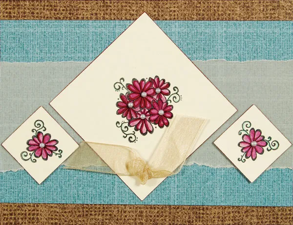 Cut the large bouquet into a 3" square; ink the edges with Aged Mahogany and glue as a diamond in the center of the card front. Cut the smaller flowers into 1 ¼" squares; ink the edges and glue on either side of the focal. Add self-adhesive pearls in the center of some of the blossoms.