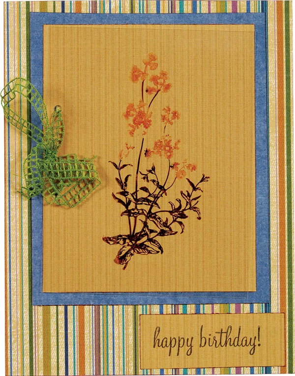 Cover the card front with striped paper and ink the edges with Aged Mahogany.
