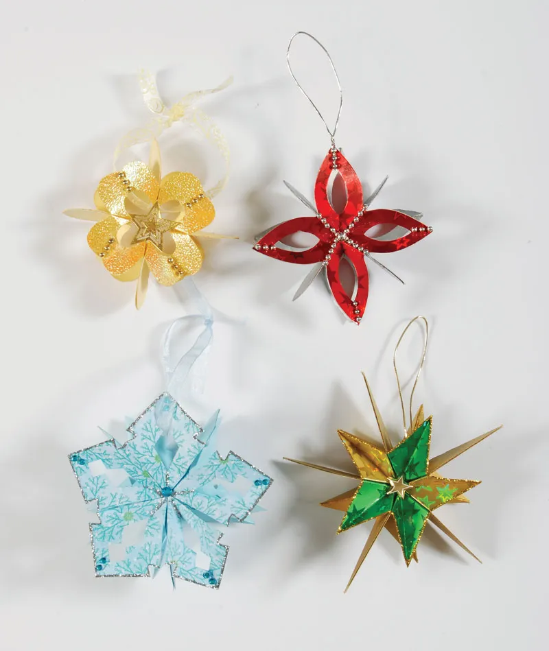 Trace and cut out the Sparkling Star ornament according to the template instructions. Cut 3 squares of green holographic stars paper, and 2 squares of the gold.