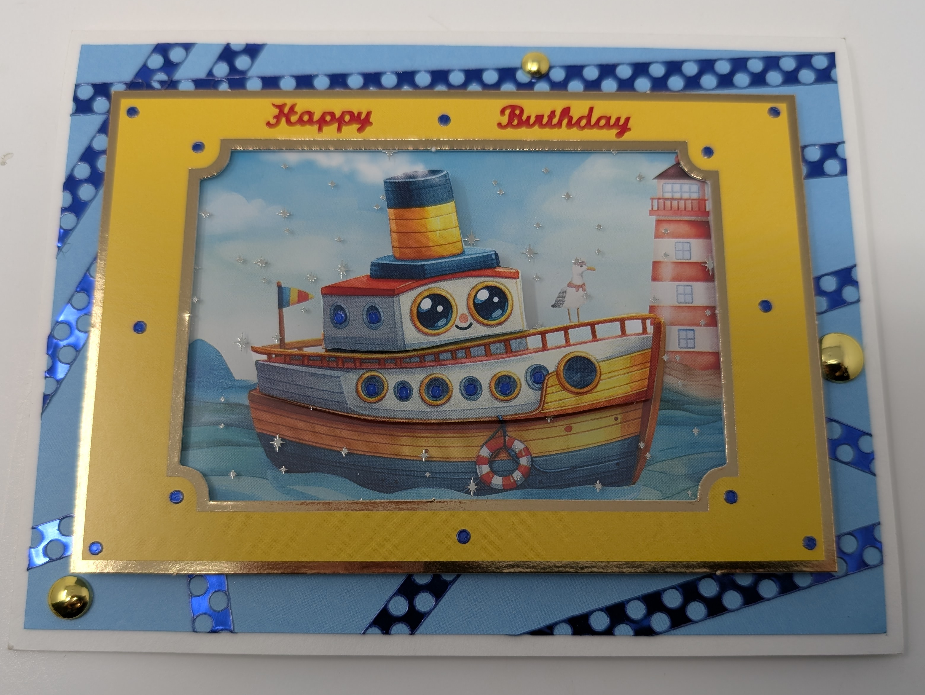 Trim out the middle of the boat and foam tape on the acetate. Trim out the top boat section and double foam tape onto the acetate. Place the border innies Dazzles™ on the frame as shown. Place red “Happy Birthday” Dazzles™️ on the top of the frame. Place gold studs as shown.