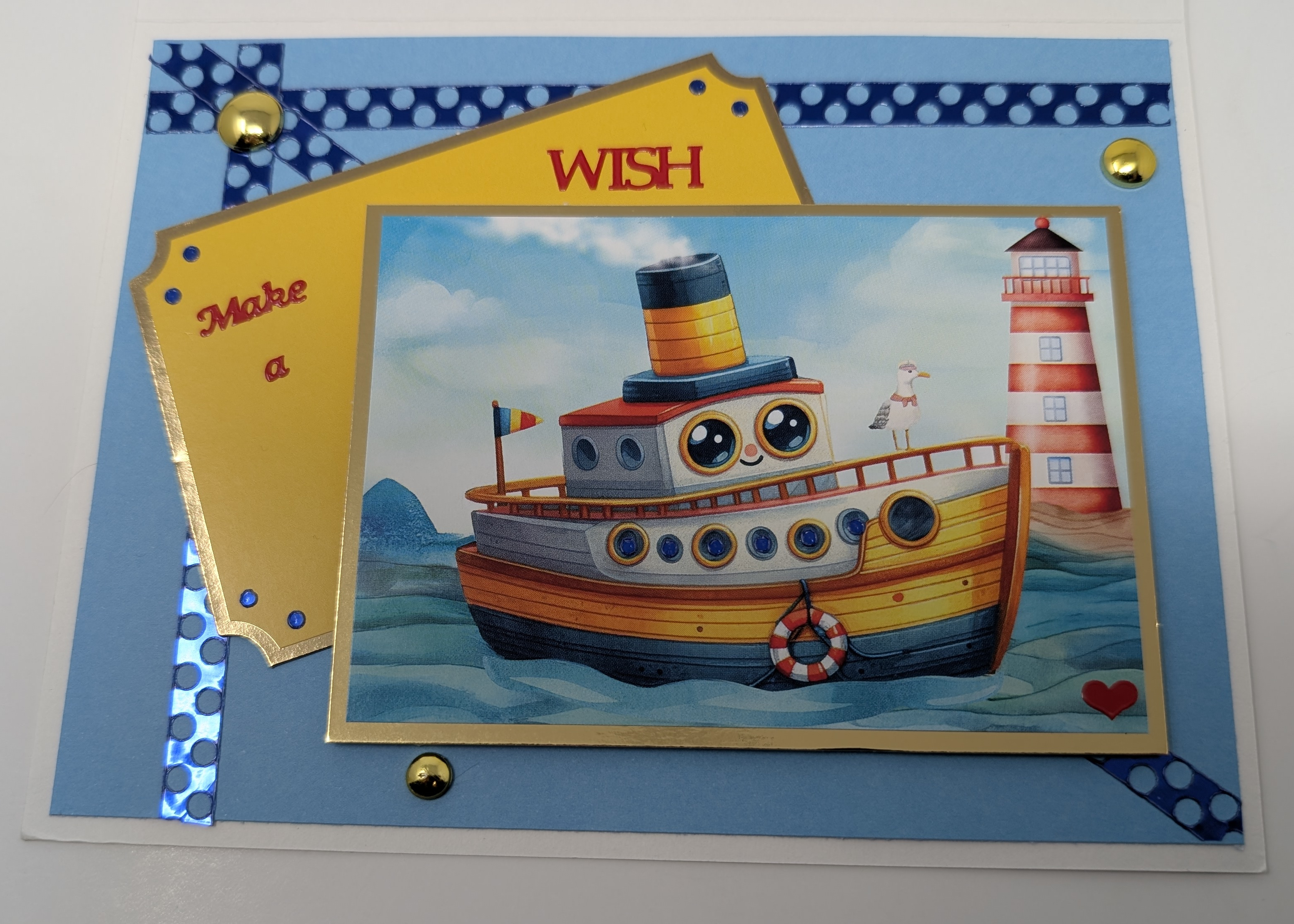 Card inside: Cut a 6 1/4”x4 3/4” blue Tulip and Butterflies 12x12 Solid Cardstock and tape to card base leaving 1/8” white borders. Place blue Dots Border Dazzles™️ as shown. Tape yellos inside aperture at an angle as shown. Mat another tugboat to gold Mirri and trim leaving 1/16” gold borders. Foam tape 1/2” from bottom and left edges. Place gold studs and border innies Dazzles™ as shown. Place red “Make a Wish” and heart Dazzles™ as shown.
