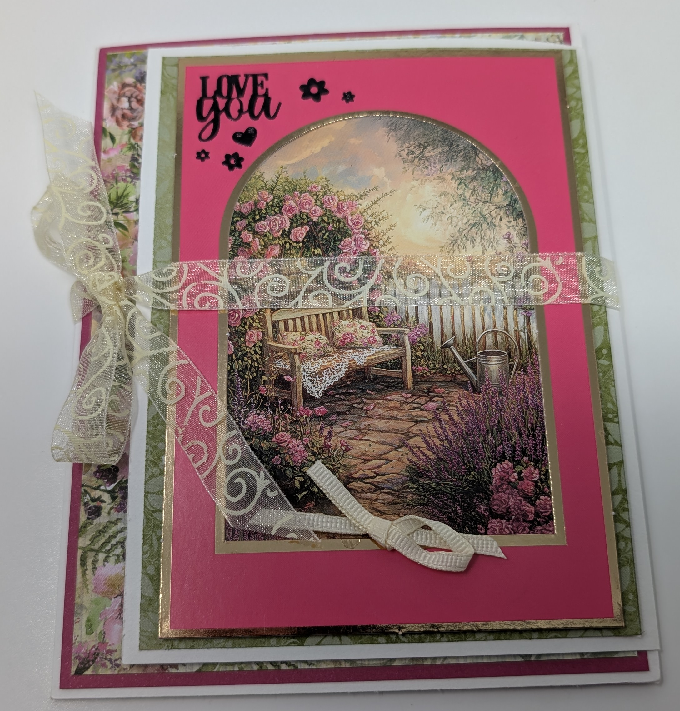 Front panel: Cut 4”x5 ½” green foliage Wildflowers and Wildlife 6x6 Papered Cardstock and tape to front leaving 1/8” white borders. Tape the bench scene from the Sunset Moments Pocket Pad to the back of the bright pink gold Apertures. Foam tape to the green foliage leaving 1/8” green borders on the left and right and 1/16” green borders top and bottom. Make and Zot™️ a 2” wide bow out of the Ivory ribbon Set and place below the image. Place “Love you” and flowers with a heart from We’re Together Dazzles™️ on the top left corner.