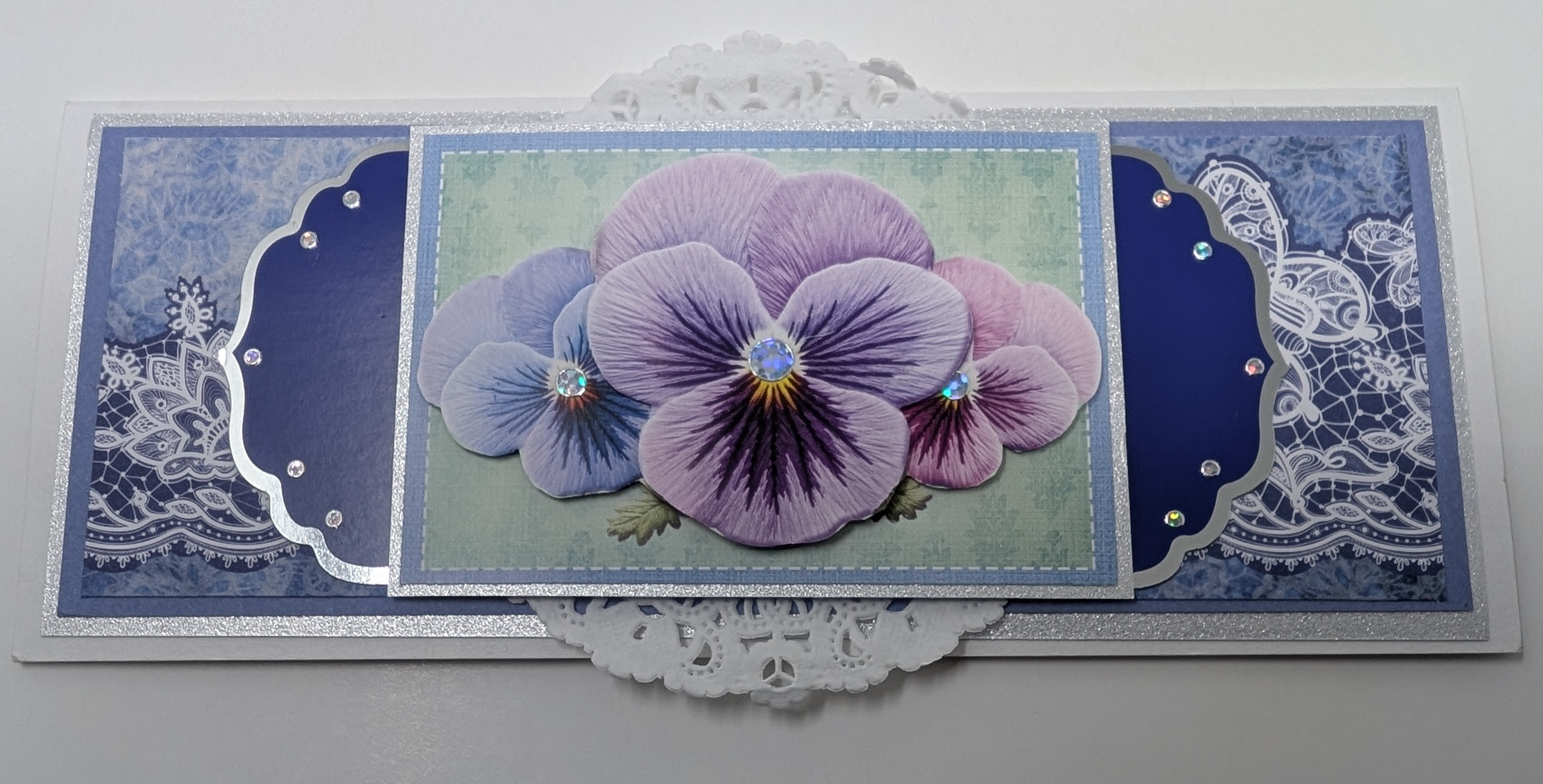 Tape a doily in the card center. Cut the inside area from blue/silver Pocket Pad Apertures in half and tape 1 1/4” from right and left sides. Mat a violet page from Pretty Posies Pocket Pad onto silver diamond paper leaving 1/8” silver borders. Foam tape centered 2” from right and left sides. Cut out and layer the pansies with foam tape. Place silver jewel Dazzles™️ as shown.