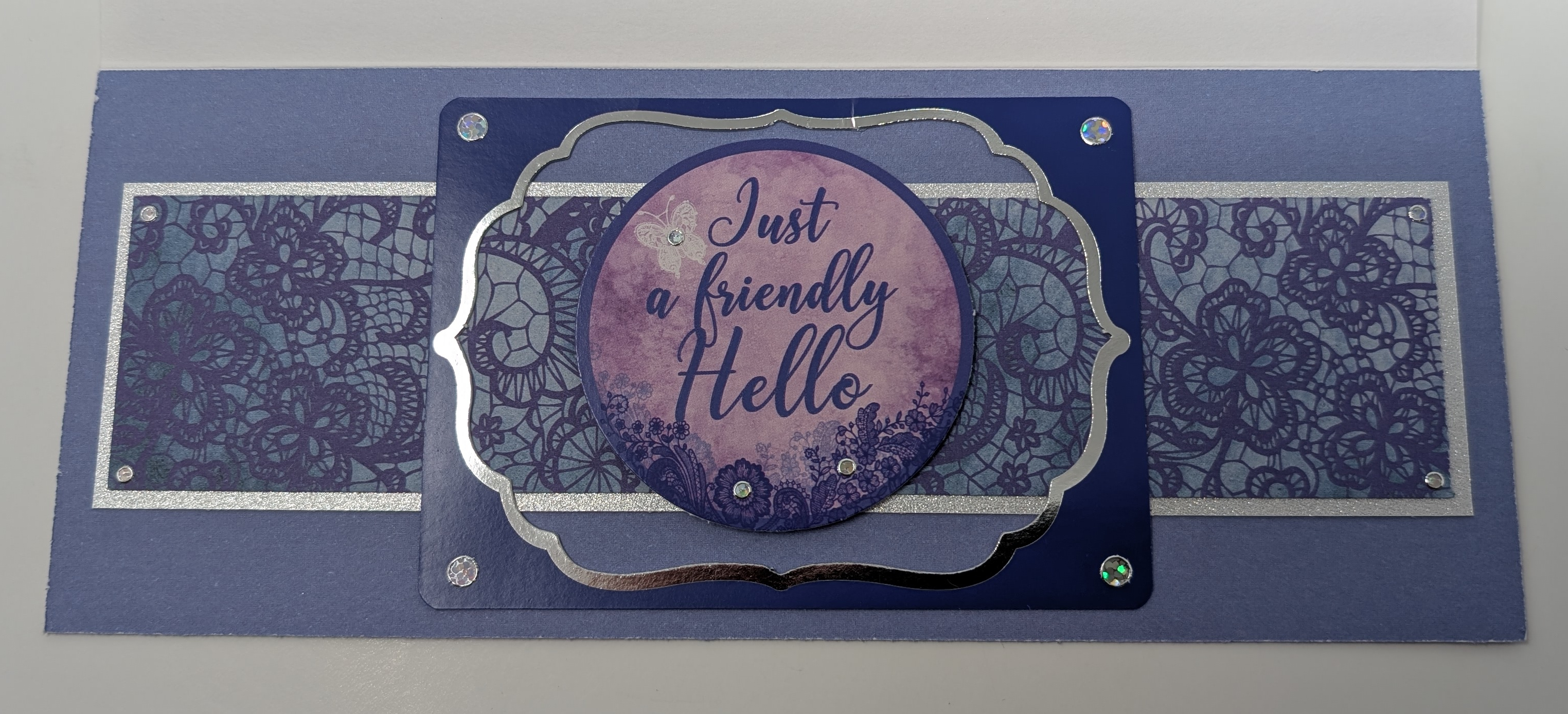 Card inside: Cover base with tape and place blue Luscious Lace 12x12 Solid cardstock on top flush to fold and one side, turn over and trim the excess. Cut 8”x2” silver Brushes Diamond paper and tape in the center. Cut 7 3/4”x1 3/4” lacey Luscious Lace 12x12 Patterned cardstock and tape to silver paper leaving 1/8” silver borders. Corner punch the outer dark blue Aperture corners and tape in the center. Foam tape die-cut in the center. Place silver jewel Dazzles™️ as shown.