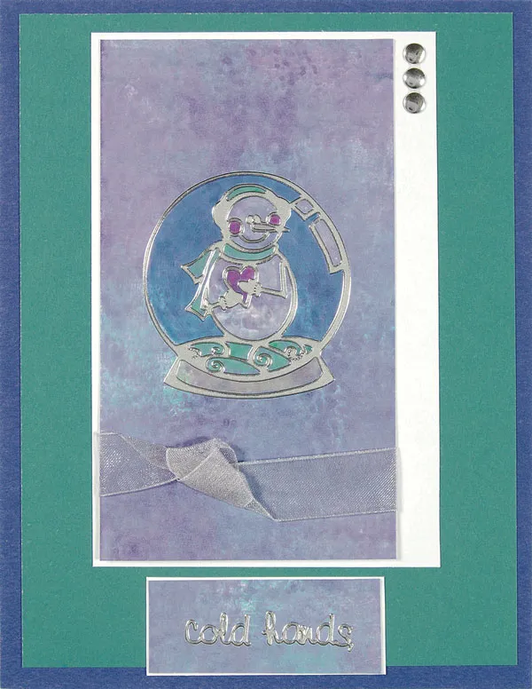 Add “cold hands” Dazzle™ to inked background, trim and mat on white cardstock and glue to the card front beneath the focal.