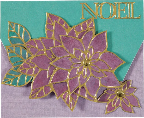 Add “Noel” sticker to the top right of the top flap. Attach leaves and large poinsettia to the top flap with glue; add medium poinsettia with foam tape. Place a gold nailhead in the center of the medium poinsettia.