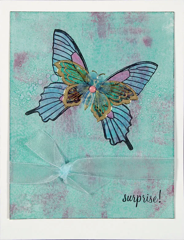 Follow the stitching guide on the Dazzles™ package to stitch the butterfly. Use a brad to secure a small blue flower in the center of the butterfly. Wrap sheer blue ribbon around the cardstock and tie in a knot at the front. Stamp “surprise” with black ink at the bottom right. Glue to the card front.