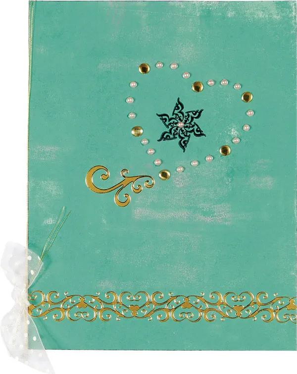 Place the heart pattern on the card front and place the gold nailheads as shown. Place three pink pearls in between each nailhead. Remove the pattern and stamp a small star with Staz-On in the center of the heart.