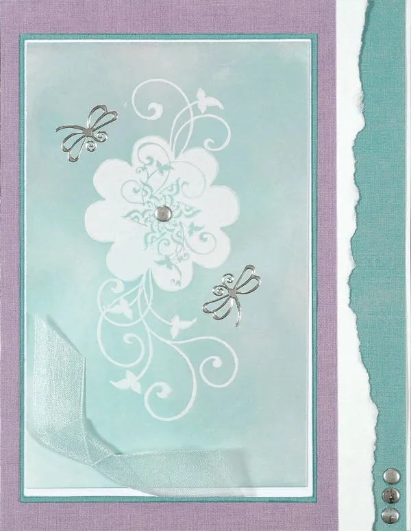Tear ¼” off the front panel of the card. Glue a 4”-wide piece of lavender paper to the card front, letting some of the torn white edge show.
