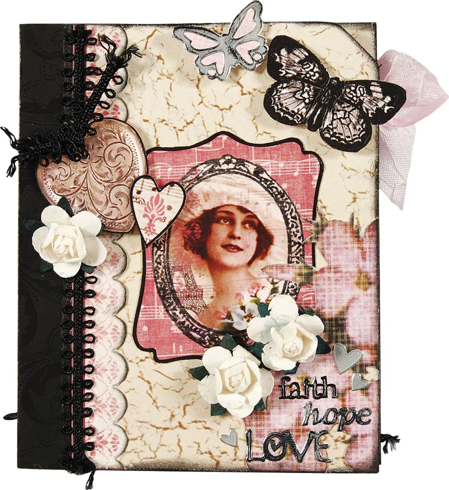 Glue the photo art centered on the crackle. Foam tape the heart locket art and a heart cut out over the ribbon, 1" from the top. Zot™ a knotted ribbon to the locket. Cut around flowers from the pink floral paper and glue on the bottom right corner overlapping the photo art. Tap word Dazzles™ with a black ink pad and let dry. Place on the bottom right corner with silver heart Dazzles™. Ink a butterfly Dazzles&trade,; place on pink paper and cut around the Dazzles™ edge. Foam tape on top with a black butterfly cut-out. Place paper roses as shown.