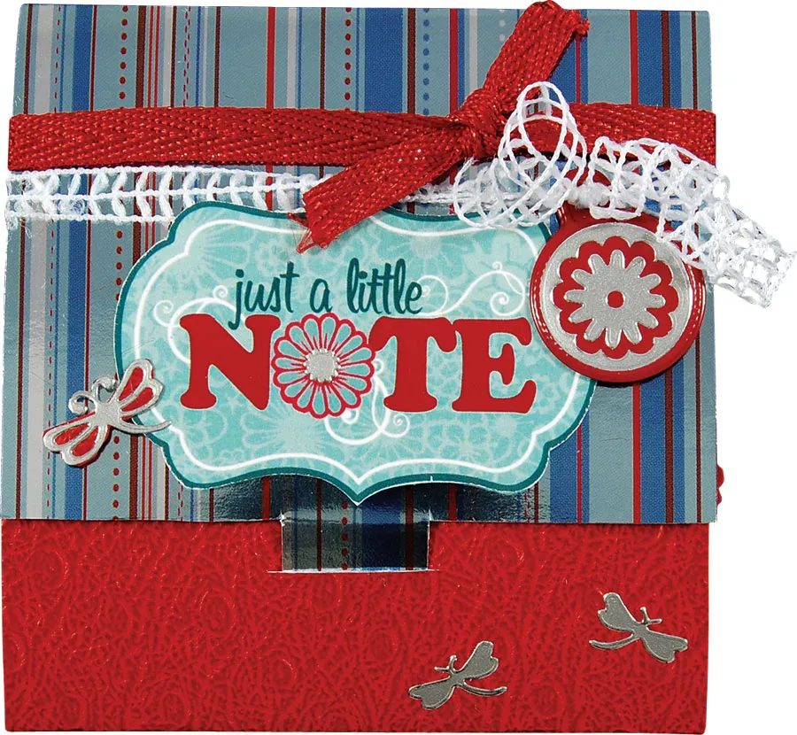 Inside: Glue the Post-it™ pad in the center. Glue a 1 3⁄4" square of striped foil on a 2" square of red peacock paper. Glue over the ribbons. Foam tape button art in the center of flowers and glue onto the foil square. Back a small flower and a dragonfly Dazzles™ with peacock paper and cut next to the Dazzles™ edge. Foam tape the flower and glue the dragonfly as shown. Tuck a small tag under the flower and place word Dazzles™ onto the tag.