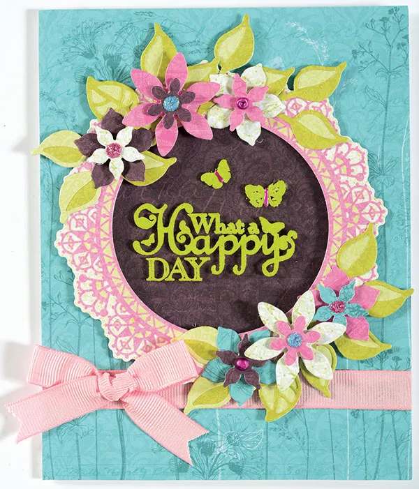 Use the Flower Frenzy Cutting Dies to cut out a variety of flower shapes and sizes and a variety of leaves as shown. Back all the evacuated leaves with complimentary green paper, using the included small leaf dies. Arrange the smaller flowers on top of the larger ones as shown, using foam tape in between the layers. Once your flowers are assembled, arrange your leaves on the top left and bottom right of the lace circle and glue down. Use foam tape to glue the flowers down as shown. For the flower centers, squeeze the following onto the centers in a fairly large dot: Waterfall Stickles&trade,; Thistle Stickles&trade,; and Hydrangea Liquid Pearls™. Let dry overnight.