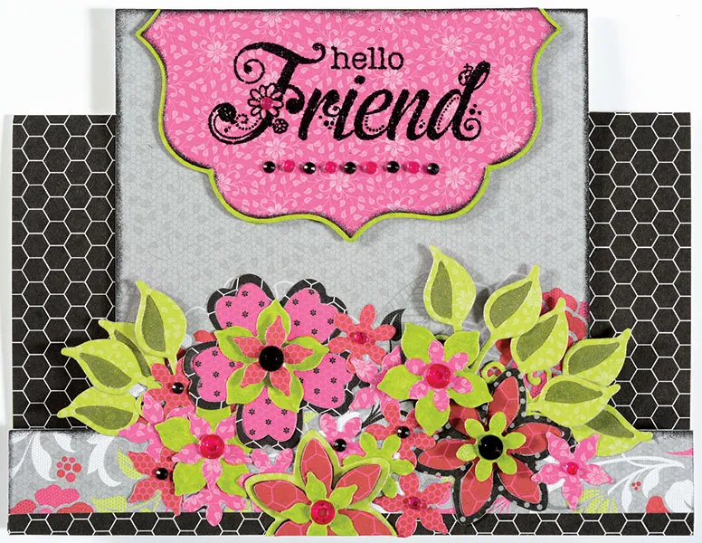 Use the Flower Frenzy cutting dies to cut out a variety of flower and leaf shapes as shown on the card. Arrange the leaves on either side and glue down. Glue down the flowers next, foam taping a few of the last ones for added dimension. Die cut a large frame from hot pink floral using the Layering Frames Cutting Dies. Set aside the frame (it won't be used). Take the inner shape and cut off the bottom 2 1/4". Stamp “Hello Friend” in the center with VersaMark™ and emboss with Zing! Black Glitter Embossing Powder. Ink edges black, mat on Honeysuckle green paper, and foam tape to the top of the card. Add a line of small hot pink and black Bling below the greeting as shown. Add one to the small flower on the F. Paint green areas carefully with the Wink of Stella Light Green Pen, including the mat on the greeting, and let dry. Cover the two side panels with Unforgettable black honeycomb paper.