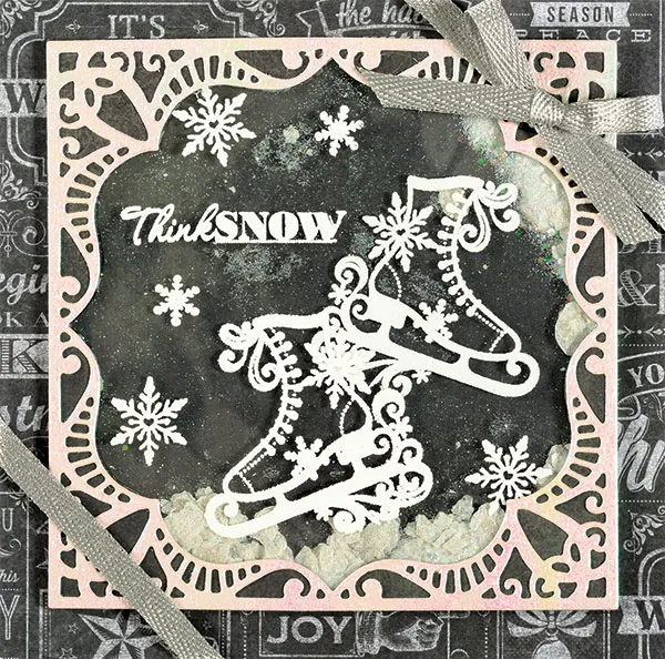 Card front: Place your card with the fold on the top. Cut your card to a 5" square. Cover with Christmas Cheer greetings paper. Cut a 4 1/4" square of Christmas Cheer black chalkboard paper and glue to center. Die cut a frame out of the 12" x 12" white pearl sheets using the cutting die. Glue onto black chalkboard paper and cut out the inner shape. Cut off any excess around the edges. Cut a 4 1/4" square of Heat Resistant Acetate. Rinse under water and pat dry with paper towels (don't rub). Stamp "Think Snow" with VersaMark™ and emboss the lower ice skate, and various snowflakes with Super Fine White embossing powder. Turn the acetate piece over and stamp and emboss the top ice skate. Flip over to the front. Place long narrow pieces of Ultra Clear Tape around the 4 sides of the acetate and place the frame onto it, pressing to adhere. Cut long narrow (about 1/8" wide) strips of foam tape and place along the 4 sides of the back of the framed acetate. Make sure all the strips are touching so there are no gaps where glitter could fall through. Fill in any gaps with more pieces of foam tape. Using the Encrusted Jewels kit, pour some fragments and glitter in a small pile (about 1/2 teaspoon) onto the center of the black chalkboard square on the front of the card. Carefully place the foam-taped frame centered on the card, trapping the fragments inside. If any fragments get stuck, tap the card on a table to loosen them. Use Zips™ to glue silver metallic ribbon diagonally across the top right and bottom left corners, trimming excess. Zot™ a silver bow at the top right as shown.