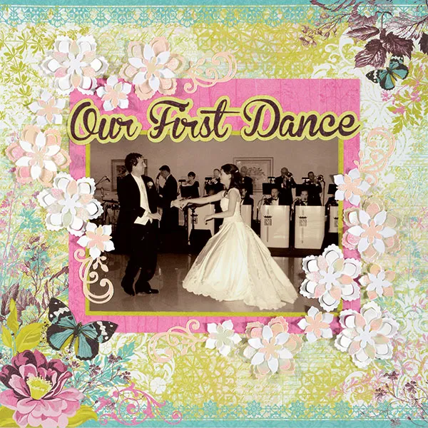 Die cut the following 6-petal flowers from white cardstock: 4 large, 4 medium, 4 small. Die cut 4 large, 4 medium, and 4 small from white pearl. Die cut 6 medium and 1 small 5-petal flowers from white cardstock. Die cut 6 small and 1 medium flowers from pearl paper. Die cut 4 flourishes from pearl paper. With the medium and large flowers, curl all the petals using your fingers, so that they are cupped. Use small Zots™ to attach the small flowers to the medium flowers. Use medium Zots™ to attach the medium flowers to the large flowers, and to attach the large flowers to the scrapbook page, in groupings in the upper left and lower right as shown. Glue the flourishes as shown.
