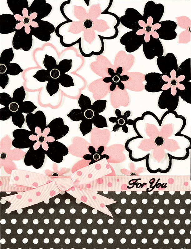 Die-cut multiple large, medium and small flowers from azalea and black suede. Glue the flowers to the top of the card as shown to create a background. Glue small flowers layered as shown and place Black Jewel Dazzles™ on the flower centers.