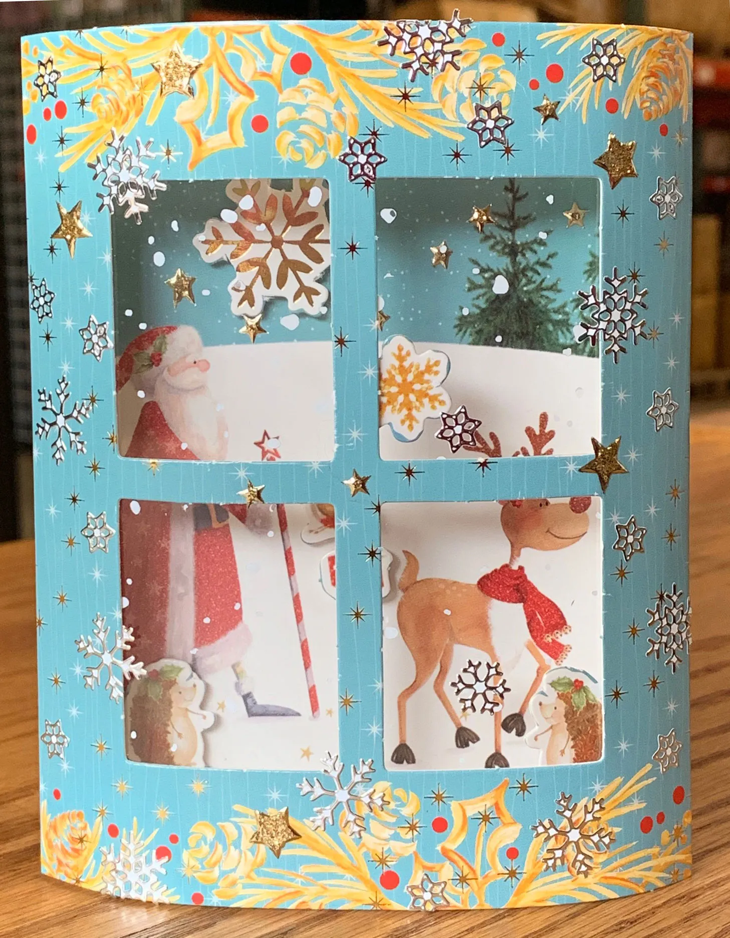Glue Snowfall Acetate to the back of the blue window using Extra Sticky Tape. Place silver snowflakes and gold stars Dazzles™ on the front of the acetate and window. Glue the hedgehog die-cut to the lower right window square and a small snowflake to the bottom left of top right panel. On the card front, foam tape the 3 die-cuts around Santa. Place Extra Sticky Tape on each flap of the window. Attach the left side first then the right side so each is even with the card edges.