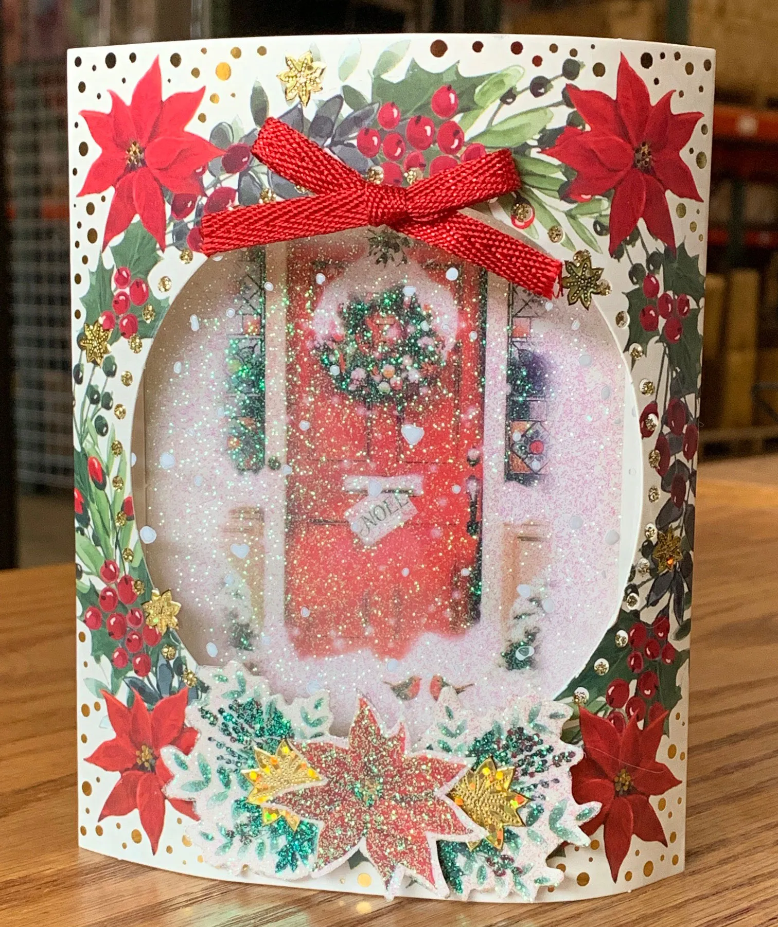 Cover the card front with a Clear Glitter Sheet, trim to fit. Pop out the tiny dots around the circle on the poinsettia window. Use Extra Sticky Tape to attach Snowfall Acetate behind the window. Place gold Stickles™ inside each empty dot, let dry. Place Extra Sticky Tape on the flaps of the window and position over the card matching the outside edges. Cover the poinsettia and green spray die-cuts with Clear Glitter Acetate. Foam tape to the window as shown. Zot a red glimmer bow to the top of the window.