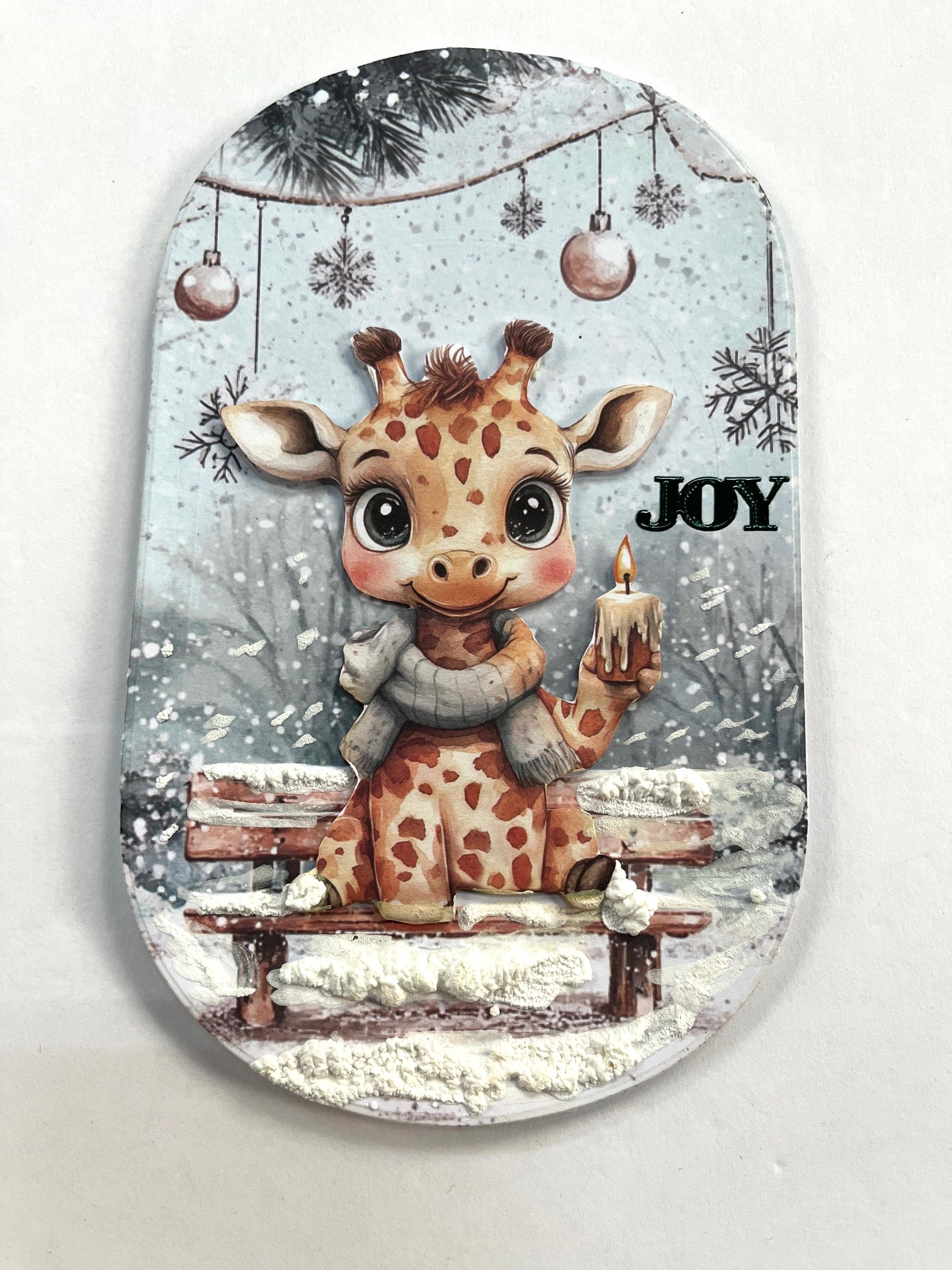 2. Cut out the giraffe holding a candle. Foam tape him sitting on the bench. Generously apply the Snowmarker pen where you want there to be snow. Heat with the heat gun and watch the snow appear. Repeat as necessary.