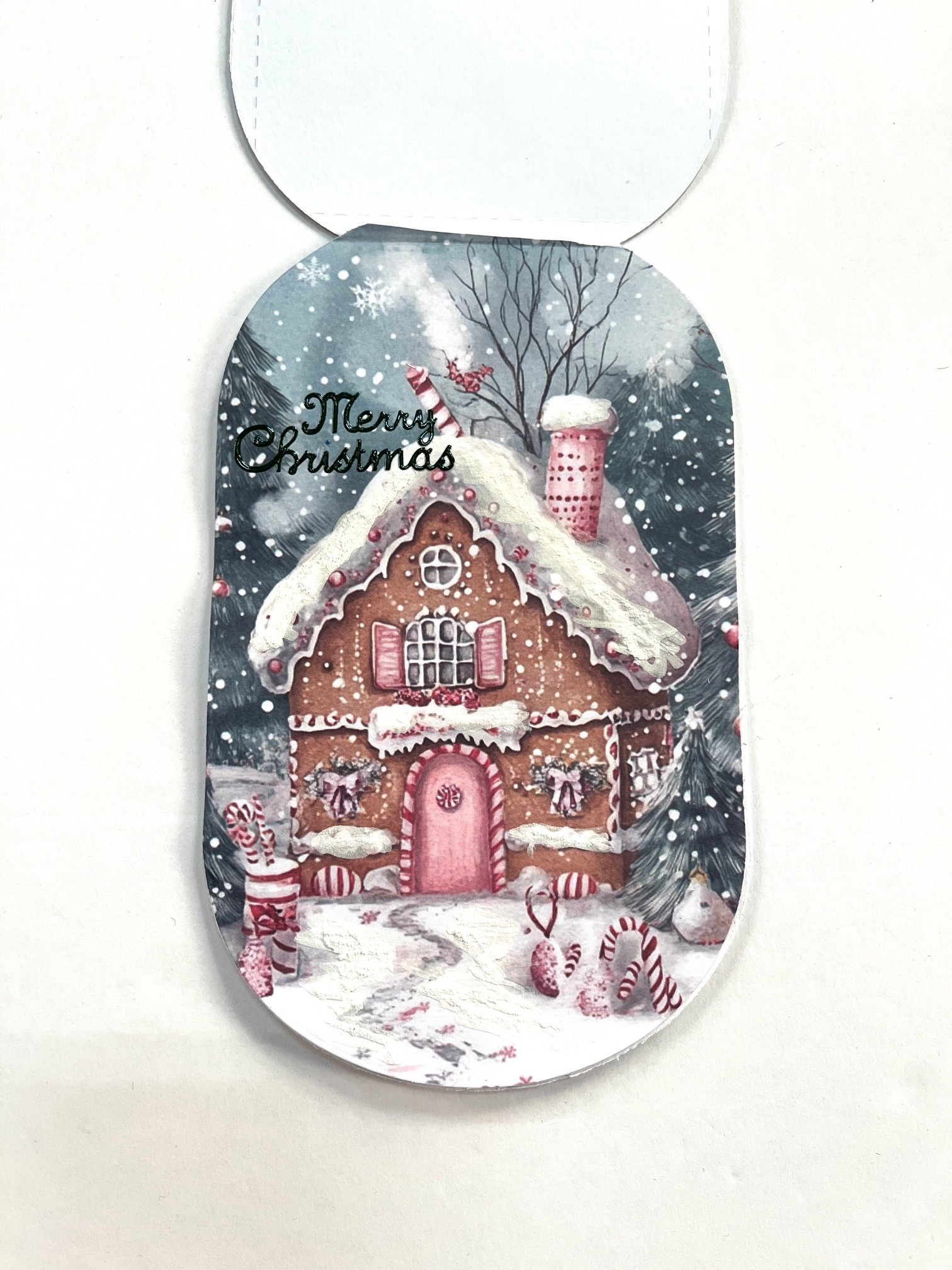 4. Inside: Use the largest Elliptical die to cut out the gingerbread house from the Holly Jolly Papers. Trim off the top and glue to the card. Apply the Snowmarker pen where you want there to be snow. Heat with the heat gun and watch it snow. Repeat if necessary. Place green “Merry Christmas” Dazzles™ as shown.