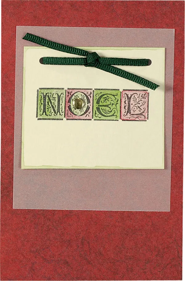 Repeat steps 1-4, using red texture paper. Color the stamp with red and green watercolors and color the edges of the focal with green. Use green ribbon to tie on the focal.