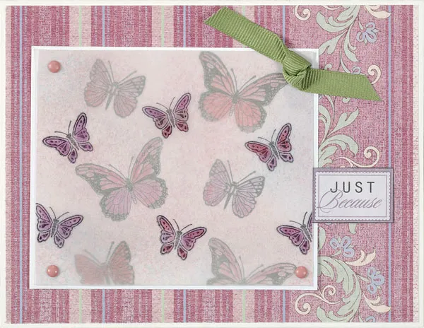 Stipple Broken China, Worn Lipstick and Dusty Concord on a 4”x3 ½” piece of white cardstock. Stamp butterflies randomly with black Staz-On, then color with pink and purple pencils. Mat on white cardstock.