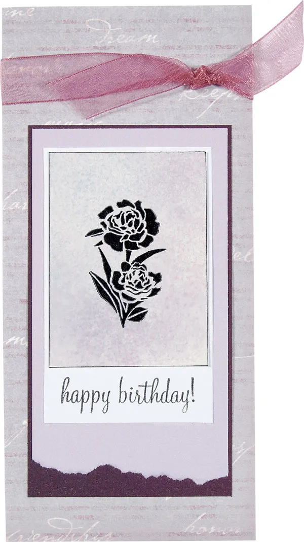 Stipple Dusty Concord on a 3”x2 ¼” piece of glossy white cardstock. Stamp rose with black Staz-On; ink the edges black. Mat on white cardstock, leaving a ¾” border at the bottom. Stamp “happy birthday” below and ink the edges black.